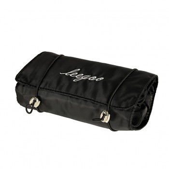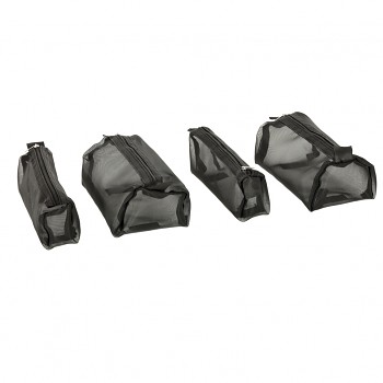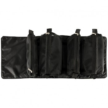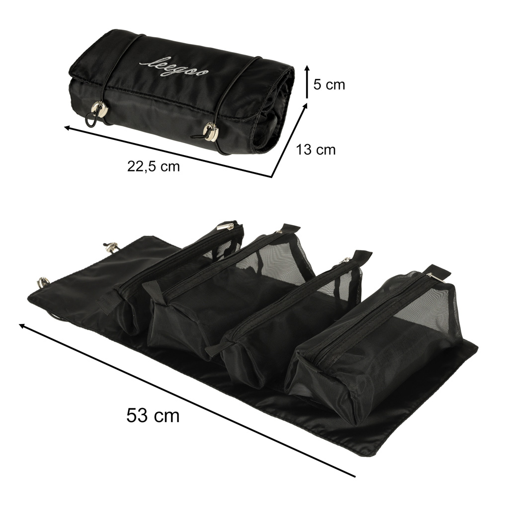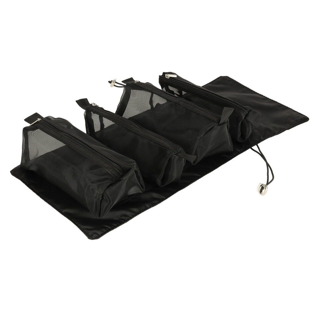 Černá cestovní kosmetická taštička - lze ji srolovat, aby v zavazadle zabírala méně místa. Má čtyři přihrádky, které lze vyjmout. Stěny přihrádek jsou vyrobeny ze síťoviny, která usnadňuje hledání výrobků a také zajišťuje dobré odvětrávání mokrých obalů.