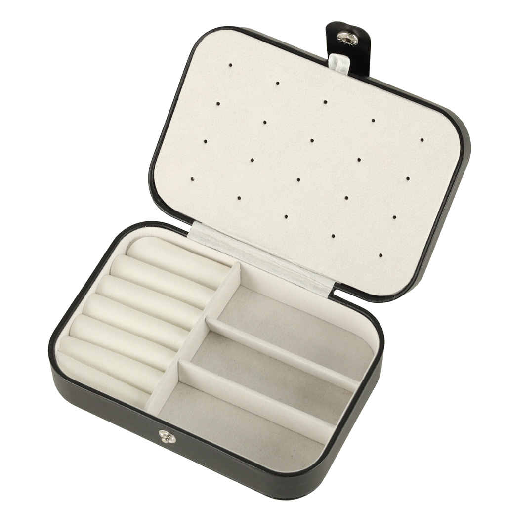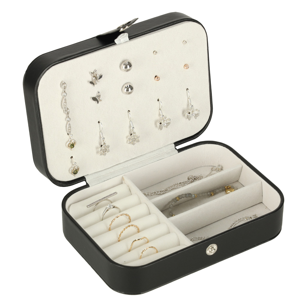 Tato šperkovnice má dvě dělení na přihrádky, 12 míst na prsteny, 10 míst na visací náušnice, další přihrádky na drobnosti a 5 háčků s kapsou na náhrdelníky. Díky tomu můžete své šperky pohodlně uložit a udržet v nich dokonalý pořádek i při větší sbírce šperků.