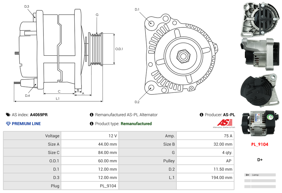 Alternátor FIAT PUNTO 1.1 1.2 STRADA 1.2 - 75A
